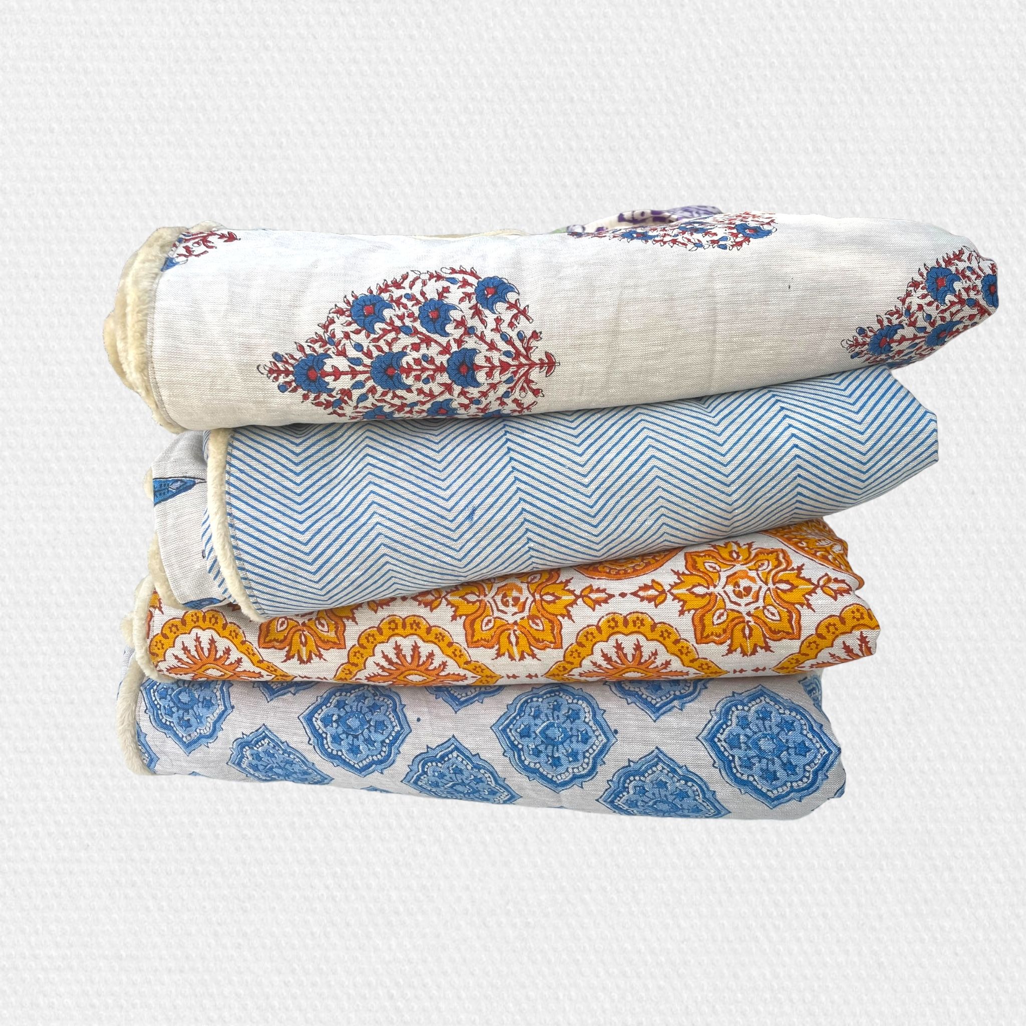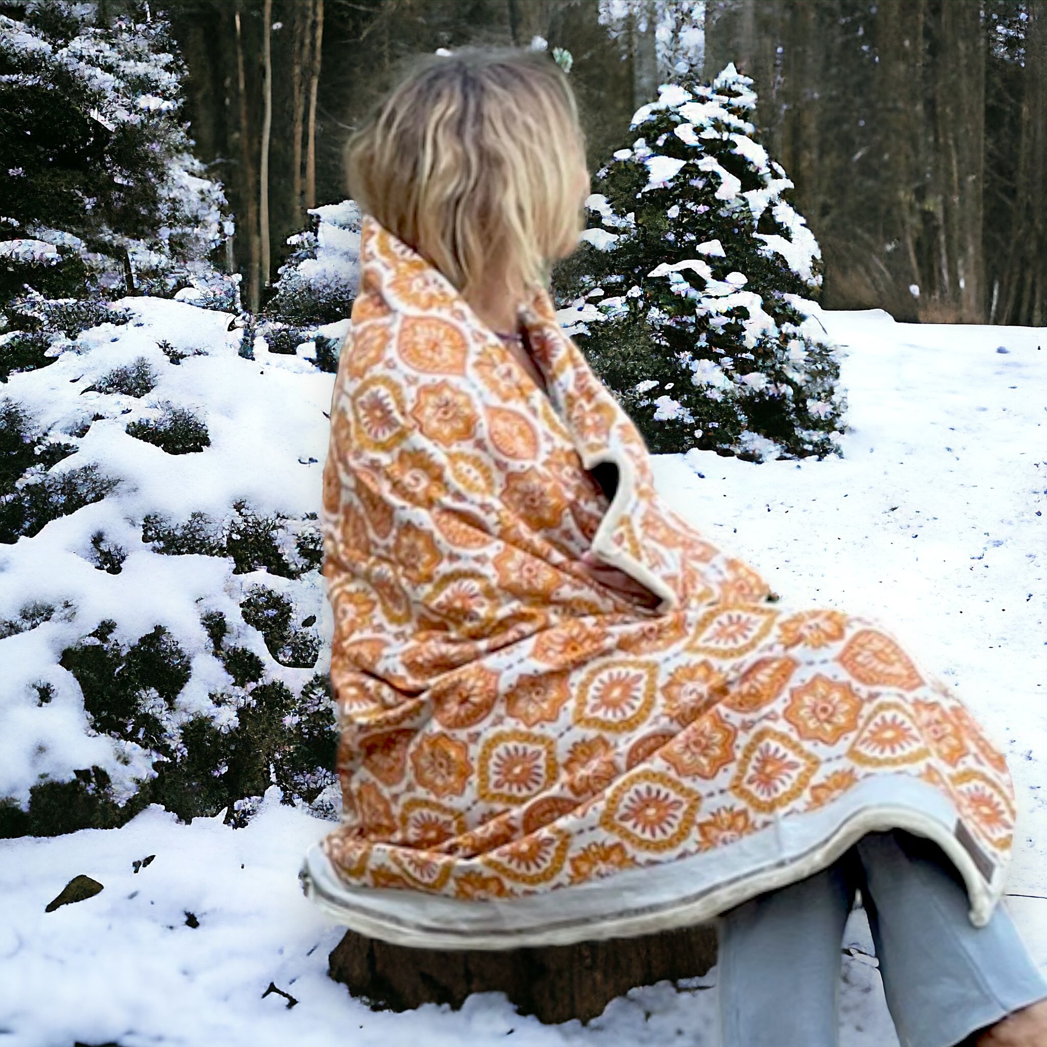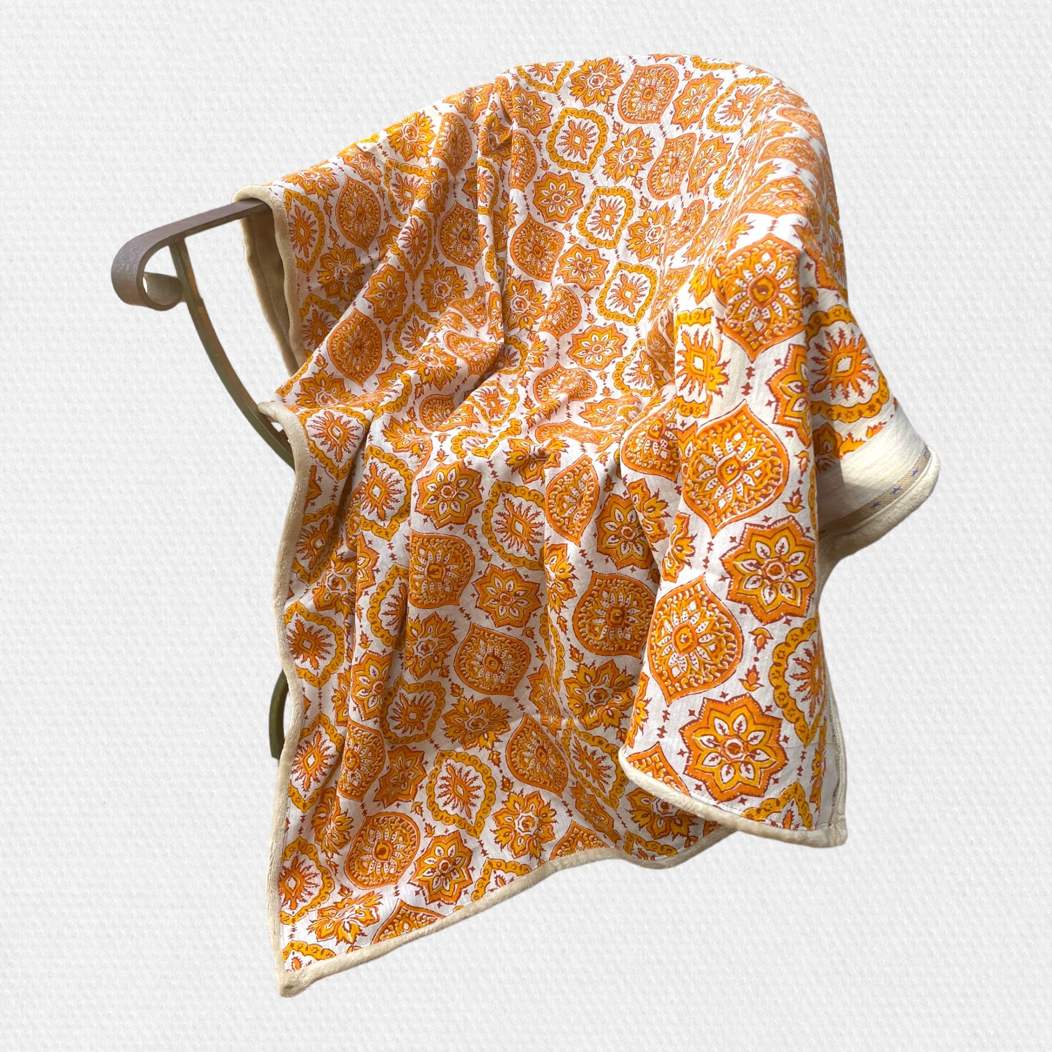 Suave manta de Lino europeo de altisima calidad tintado a mano por el tradicional sistema de Block Print 100% ARTESANAL, y el reverso de suavísima manta coral fleece. Un lujo de manta con la que podras sentir la ligereza, suavidad y belleza de sus diseños Usala en tu sofa, cama, cuna de bebe, yoga, meditacion… para llevartela a cualquier sitio dando un toque de color y elegancia. Amamos el trabajo artesanal hecho con Amor. Una pieza que es una pequeña joya para disfrutar.